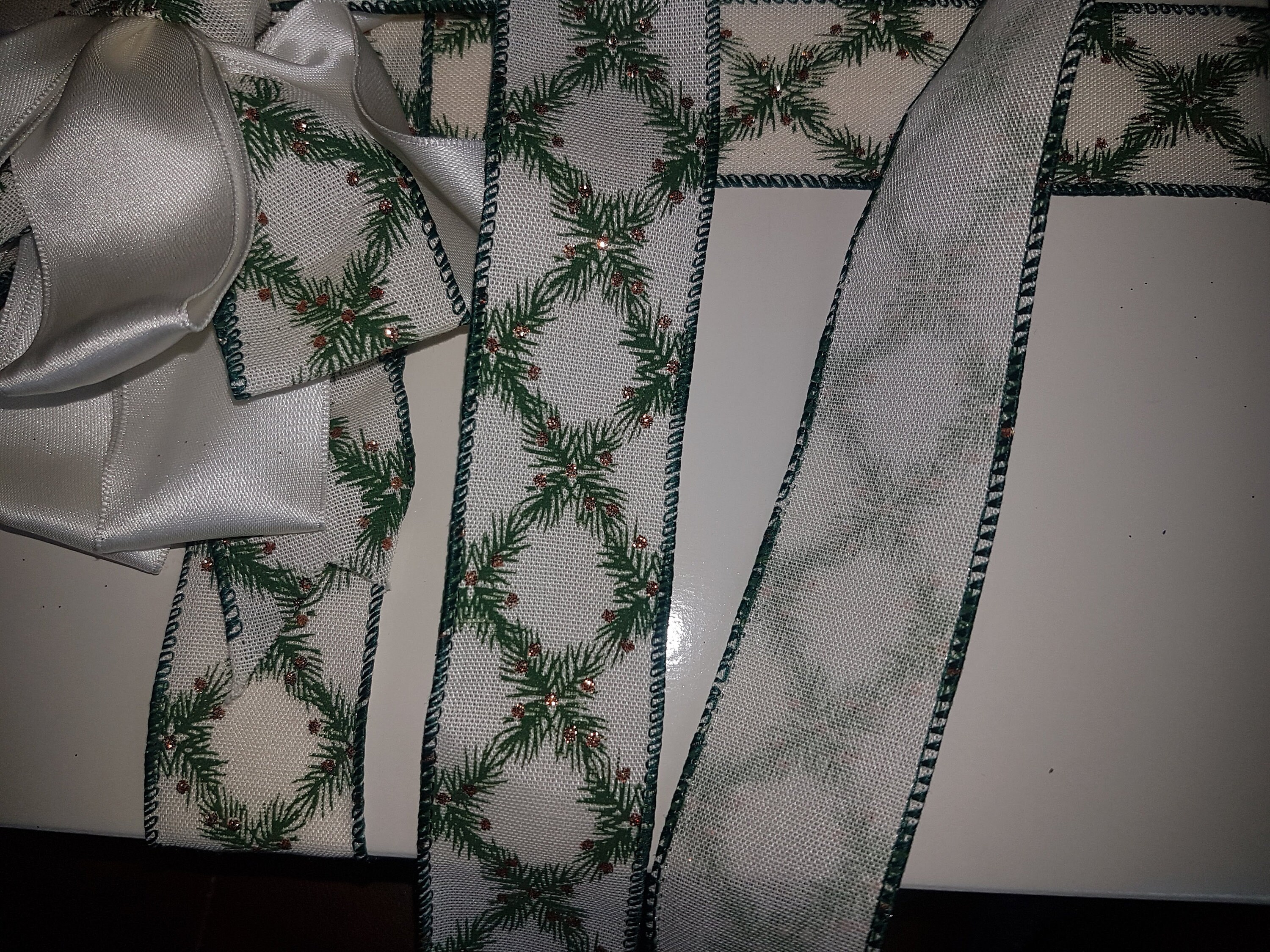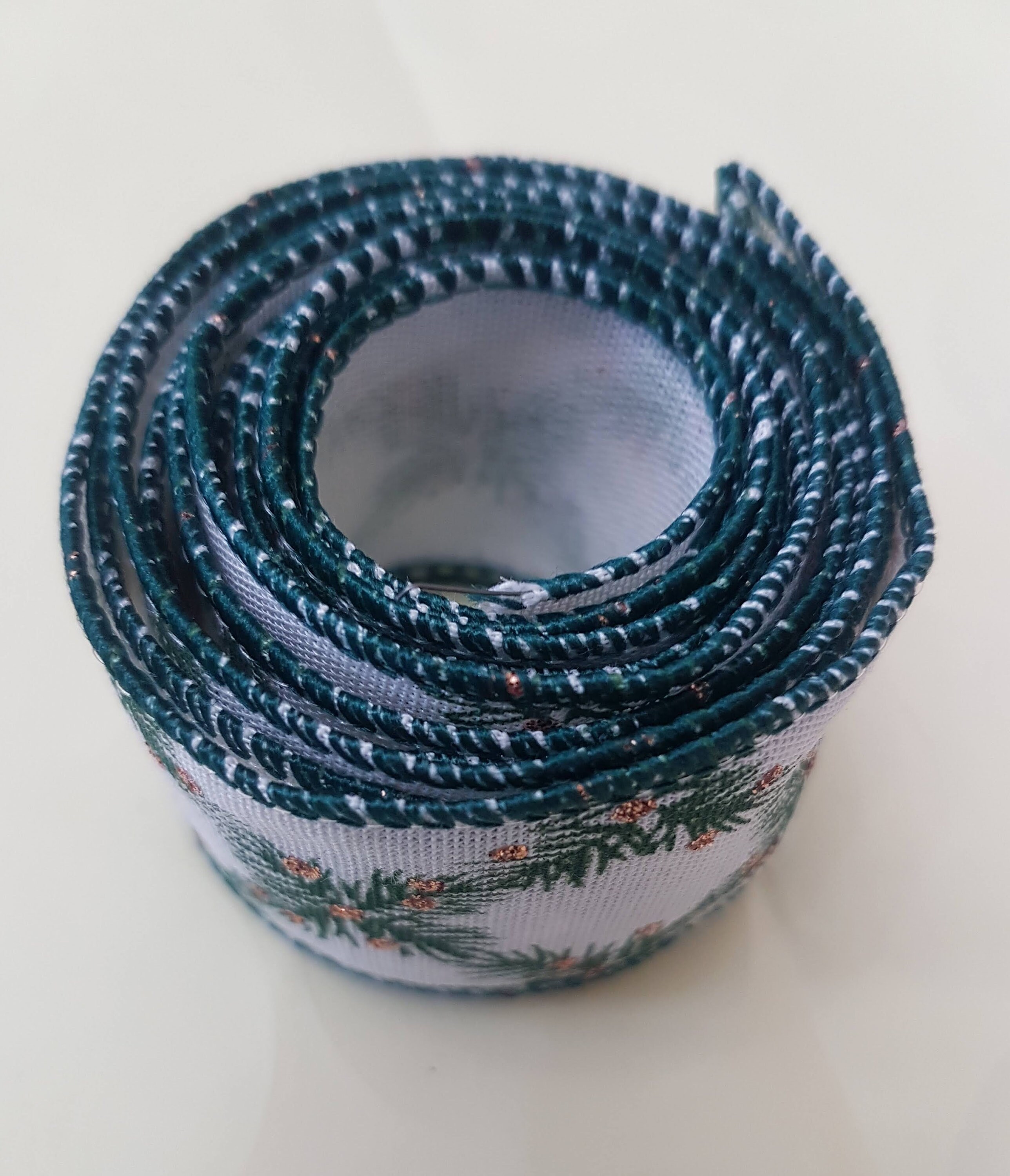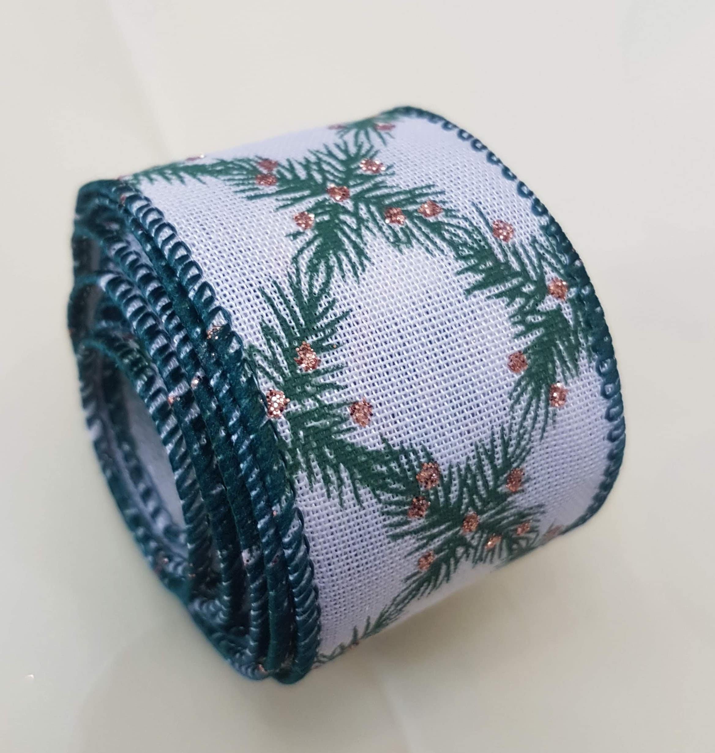 This gorgeous ribbon is on sale. It is subtle and classy. 38mm (1.5 inches) Christmas green and ivory ribbon with glitter, vine decoration print, it's good for gifting and Christmas tree decoration.