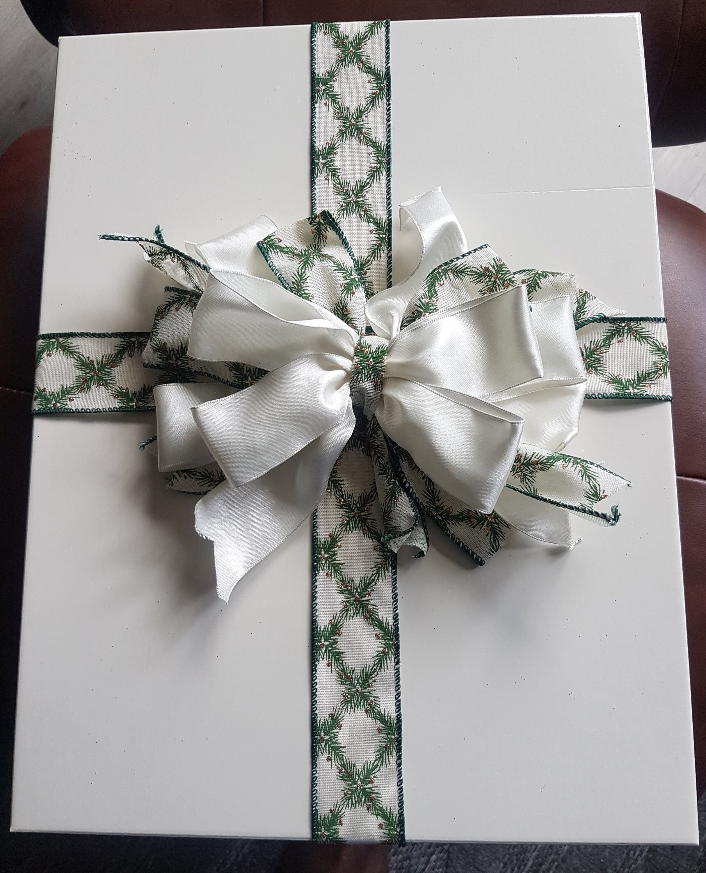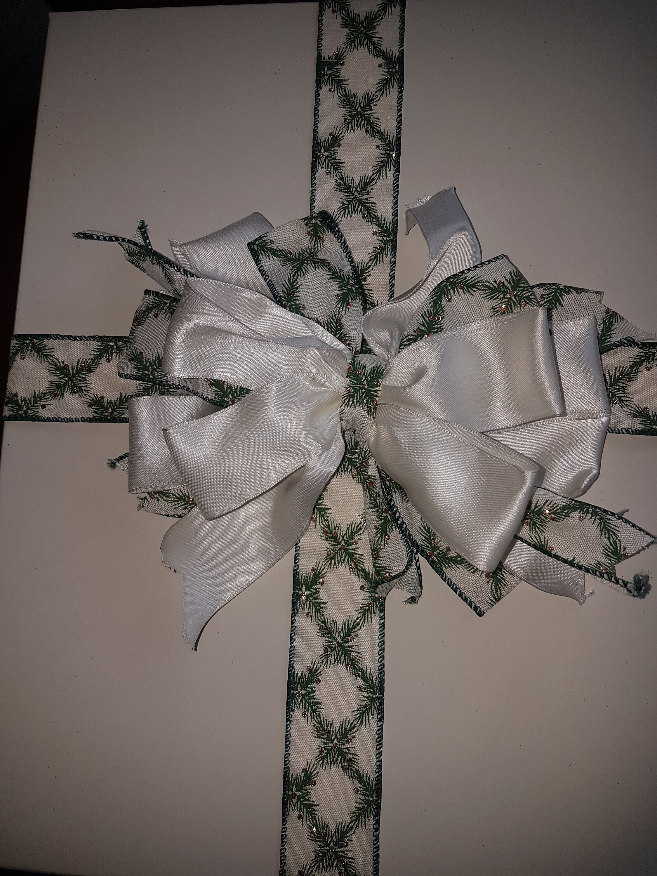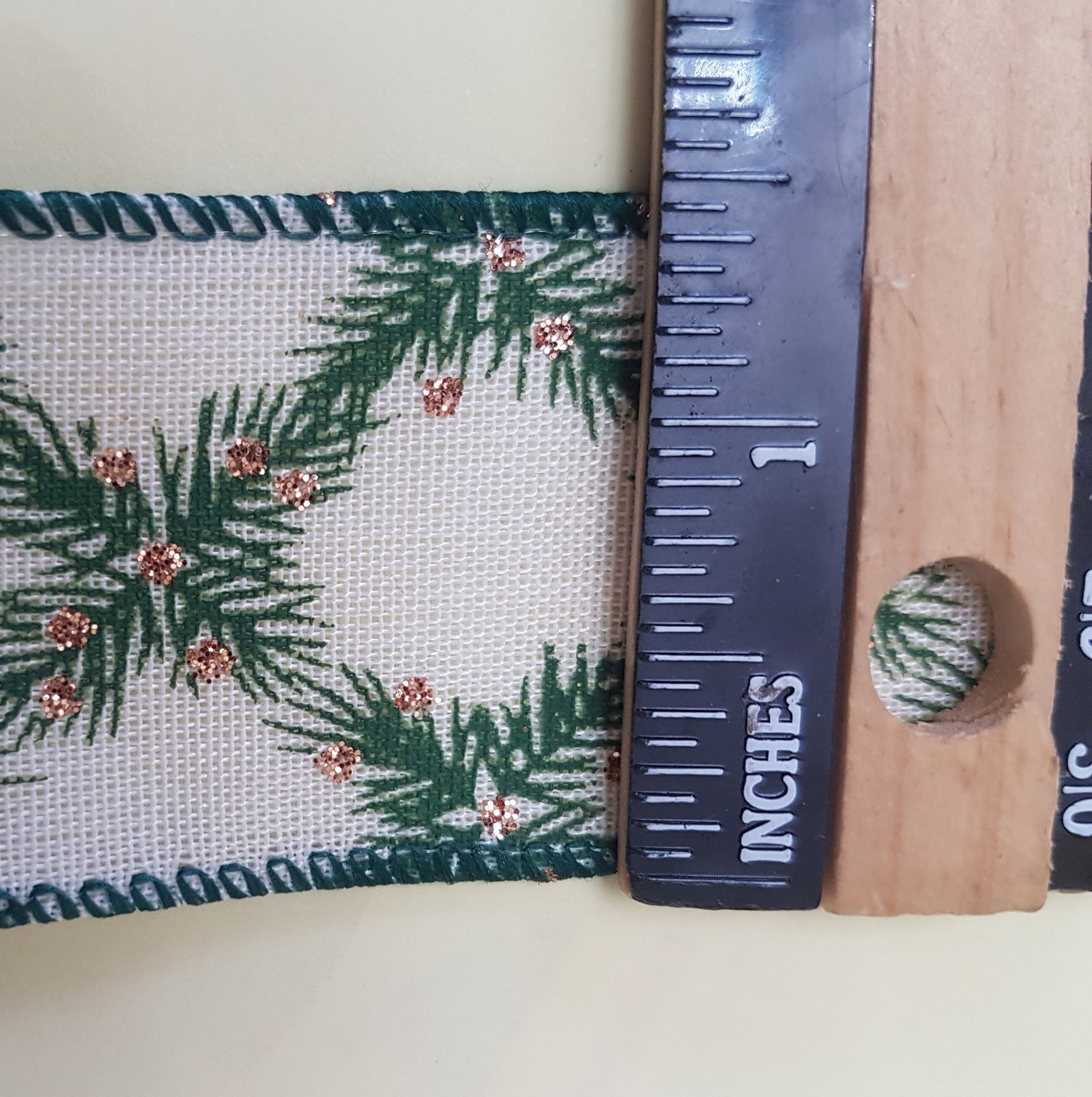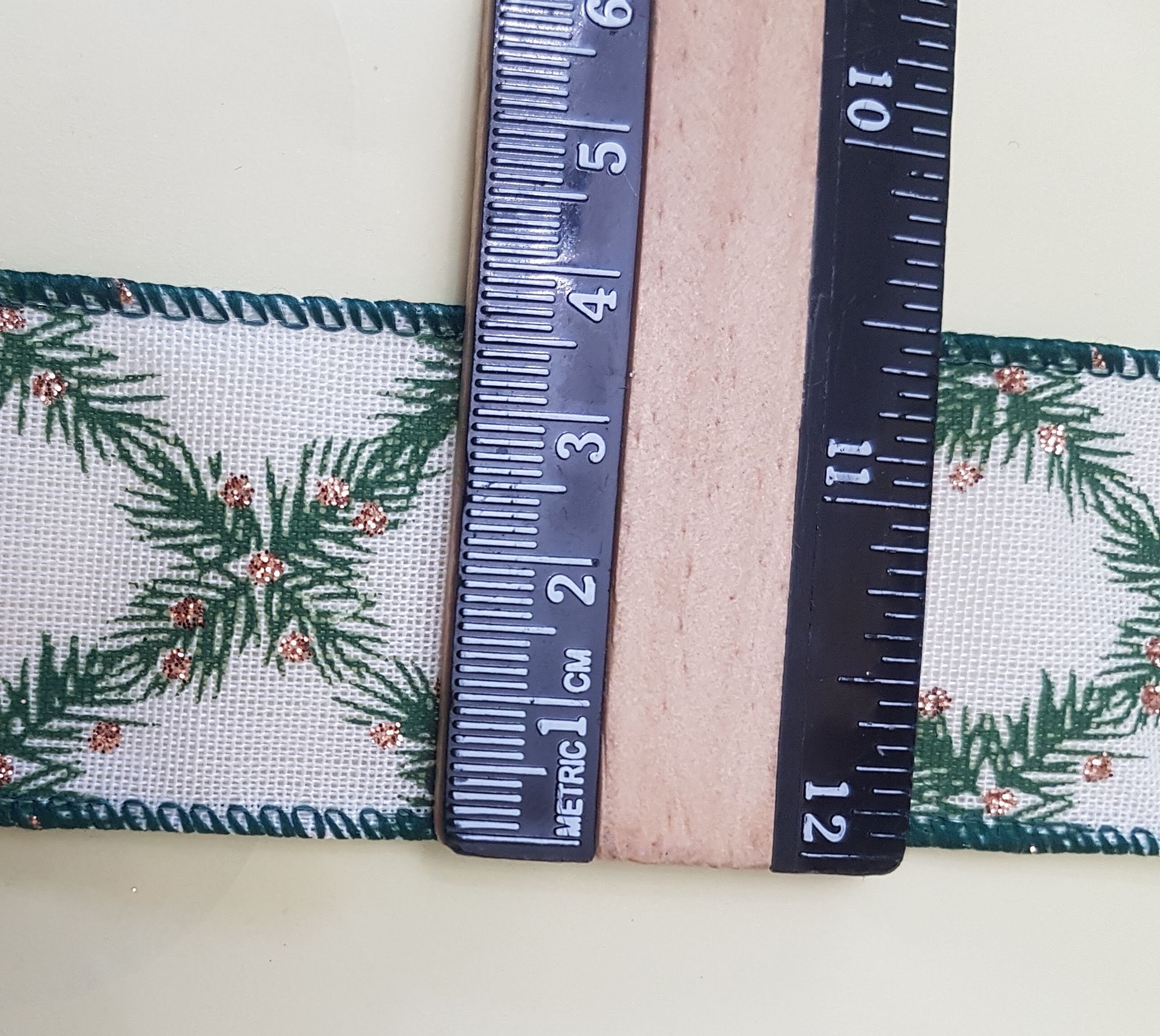 This gorgeous ribbon is on sale. It is subtle and classy. 38mm (1.5 inches) Christmas green and ivory ribbon with glitter, vine decoration print, it's good for gifting and Christmas tree decoration.