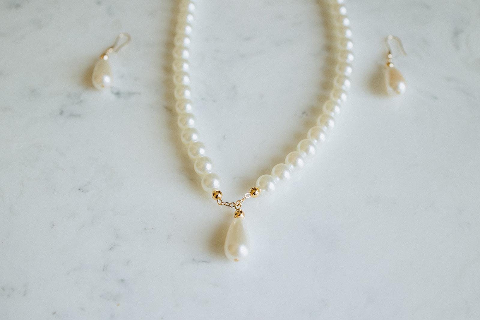 Elegant Glass Pearl Necklace with Ivory Teardrop Pendant Finished With a Gold Clasp
