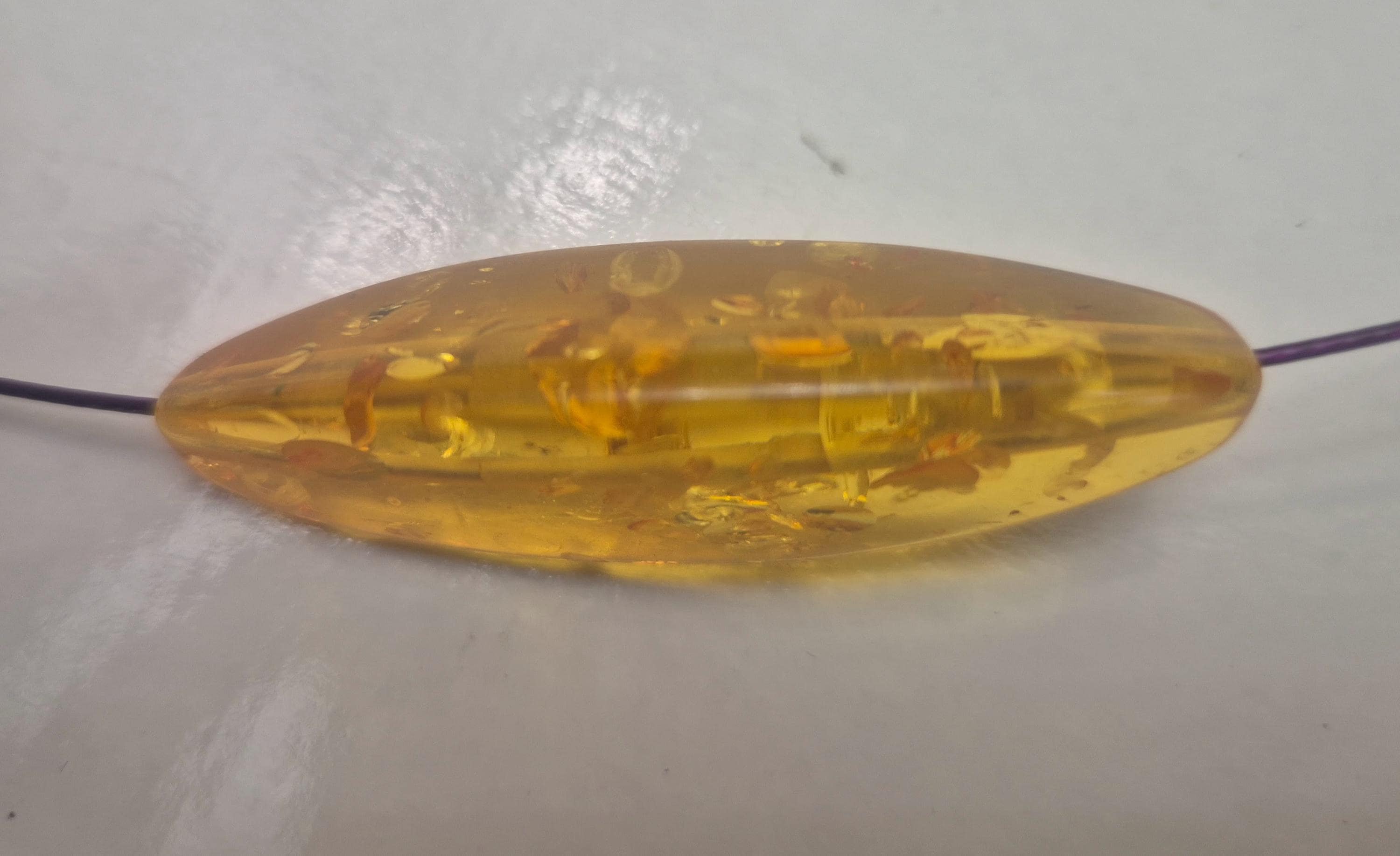 Discover the natural beauty of this stunning large yellow amber bead, measuring approximately 55 x 18mm. Perfect for creating a unique jewelry piece, this single amber bead showcases warm, golden hues with a rich, translucent glow that captures the light beautifully. It is a one-of-a-kind treasure, featuring organic inclusions and a smooth, polished surface that highlights its authentic character.